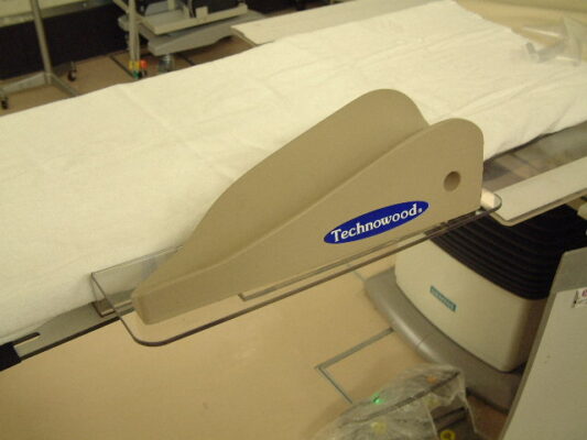 | Slightly elevated platform is on the existing patient table seamlessly, and patient’s arm is placed in comfort with an easy puncture site exposure. |
